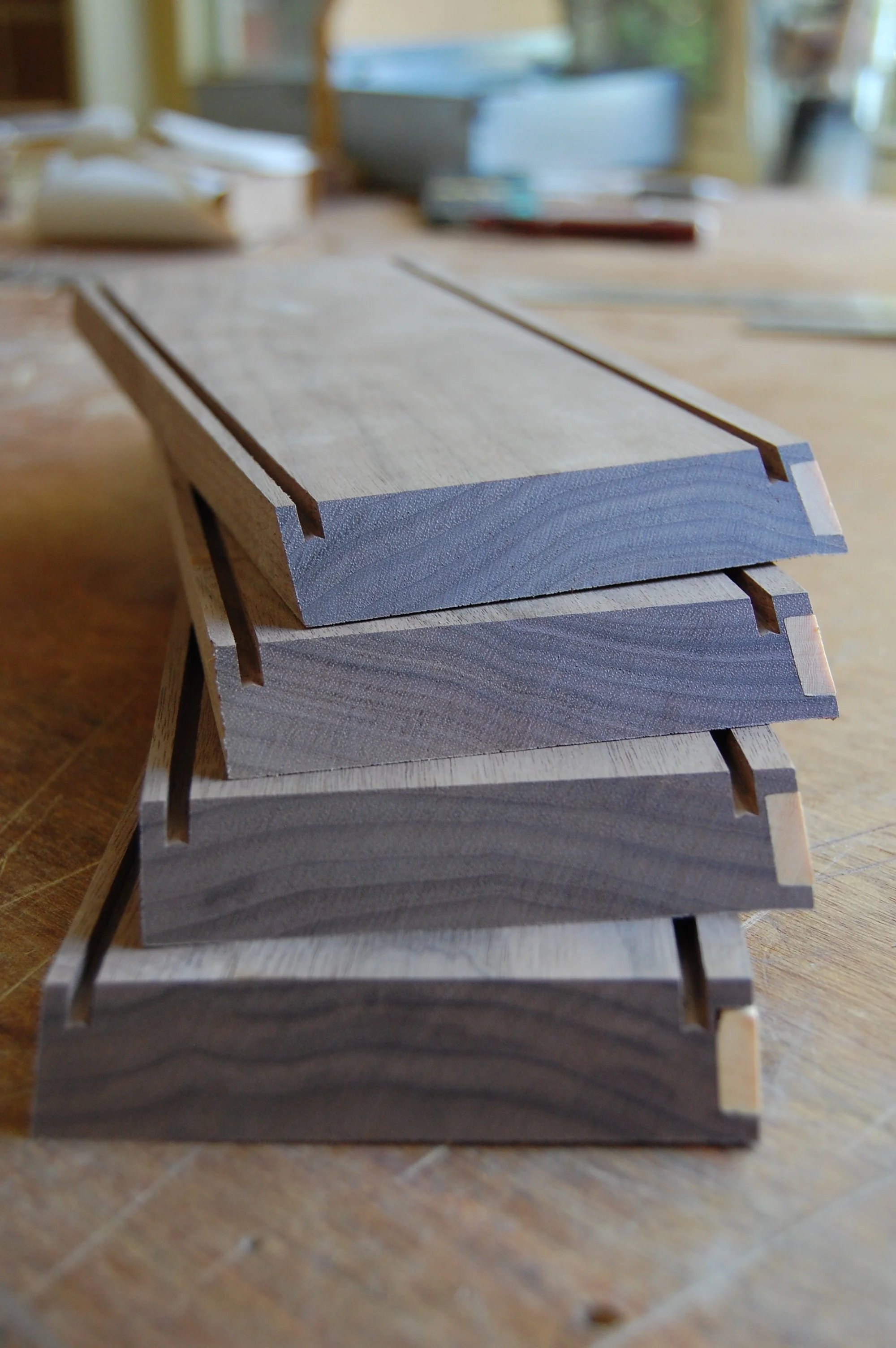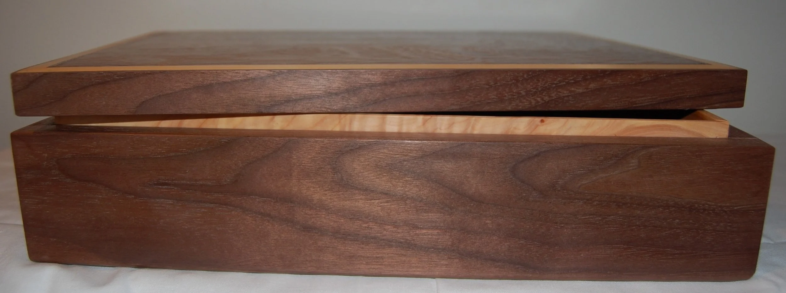The box itself it made from Walnut with a Blackbean lid. Huon Pine is used as an accent on the lid and to line the inside of the box.